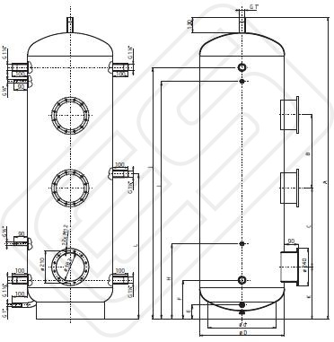 NAD 500, 750, 1000 Akumulační nádrže NAD jsou vyráběny s možností rozmístění jedné až tří přírub. Příruba s roztečí šroubů 210 mm se může použít pro montáž přírubové topné jednotky TPK. Na zakázku lze rozmístění nátrubků i jejich množství změnit. Ve standardním provedení je příruba zaslepena.